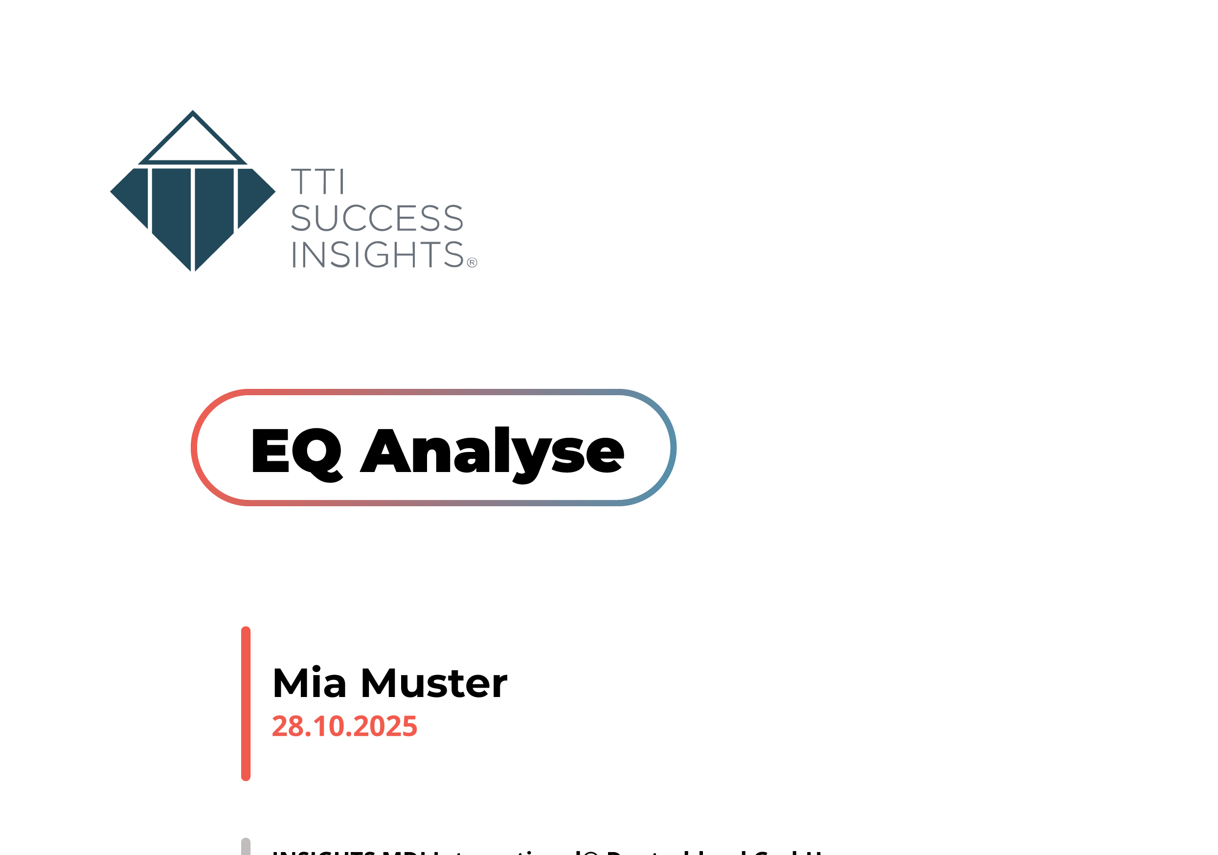 Die INSIGHTS MDI® Emotional Quotient Analyse wurde entwickelt, um Menschen dabei zu unterstützen, ihr Bewusstsein für fünf miteinander verbundene Bereiche der emotionalen Intelligenz zu stärken. Sie gibt Einblicke in die aktuelle Ausprägung dieser Bereiche, zeigt auf, wie sie das Handeln beeinflussen können, und liefert praxisnahe Anregungen zur Weiterentwicklung. Diese Analyse bewertet oder verurteilt nicht; sie unterstützt Wachstum, indem sie dazu anregt, das eigene Auftreten und die Interaktion mit der Umgebung zu reflektieren.